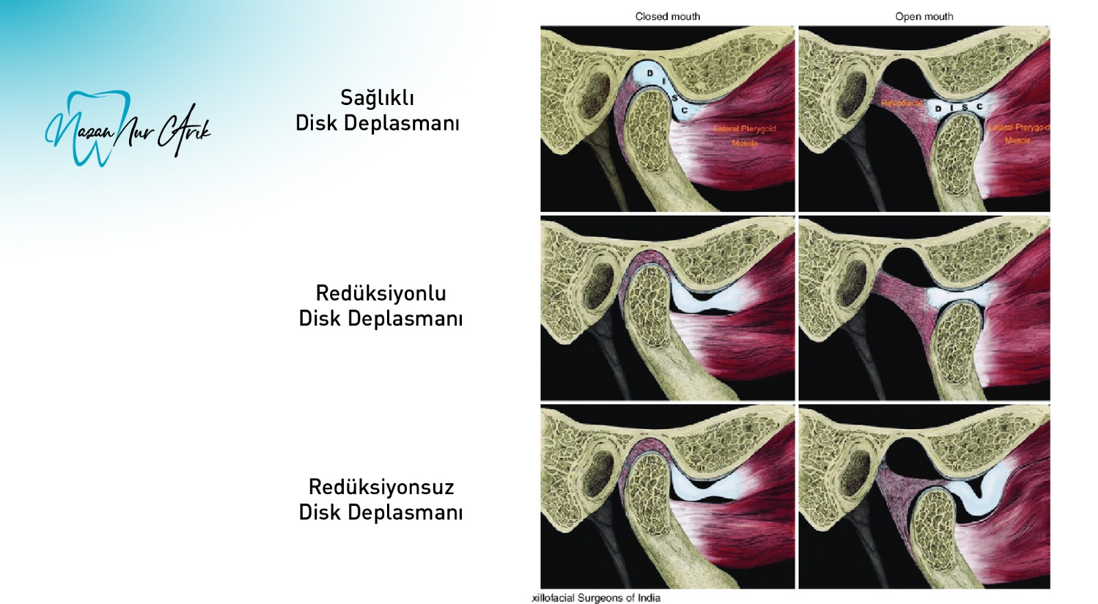 Disk Deplasmanı anlamı diskin kondil ile uyumunun bozulduğunu ifade eder. Redüksiyonlu disk deplasmanının anlamı ise deplase olan diskin yeniden kondil ile ilişkiye girebildiğini ifade eder. Yani Redüksiyonlu Disk Deplasmanında disk kondilin önünde yer alır ve deplase olmuştur. Ağız açma hareketi ile kondil-diski yakalar ve ağız açıkken kondil disk uyumlu bir pozisyondadır. Ağız açılırken kondilin diski yakalama durumunda ses gelir. Ağız kapanırken de yine ses gelebilir.